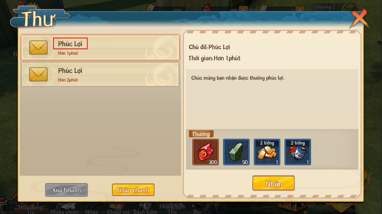 - Bước 3: Quay lại mục Thư để nhận phần thưởng đã nhập giftcode