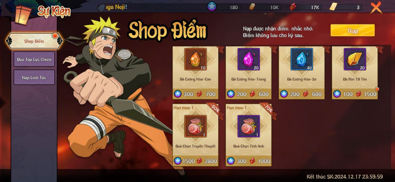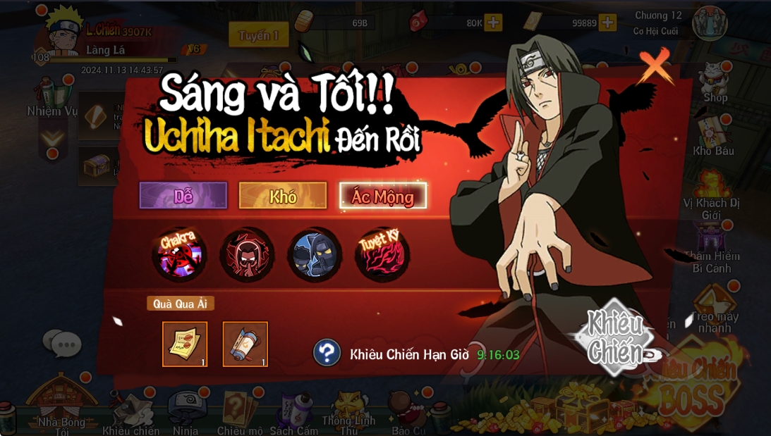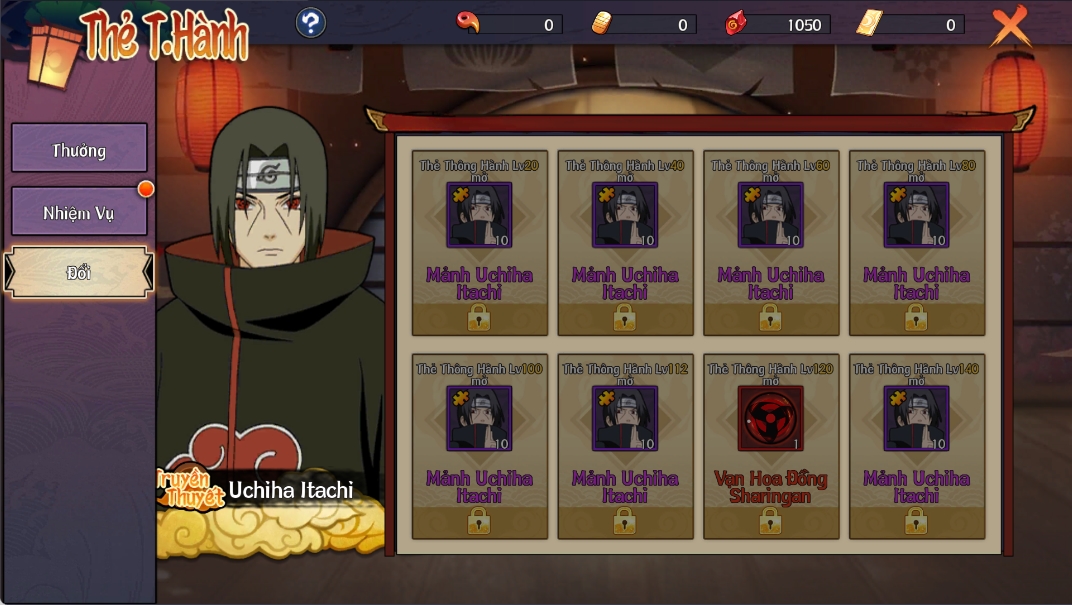 - Thưởng lớn cần quan tâm là Ninja Truyền Thuyết Uchiha Itachi và TB Chuyên của Ninja Uchiha Itachi.