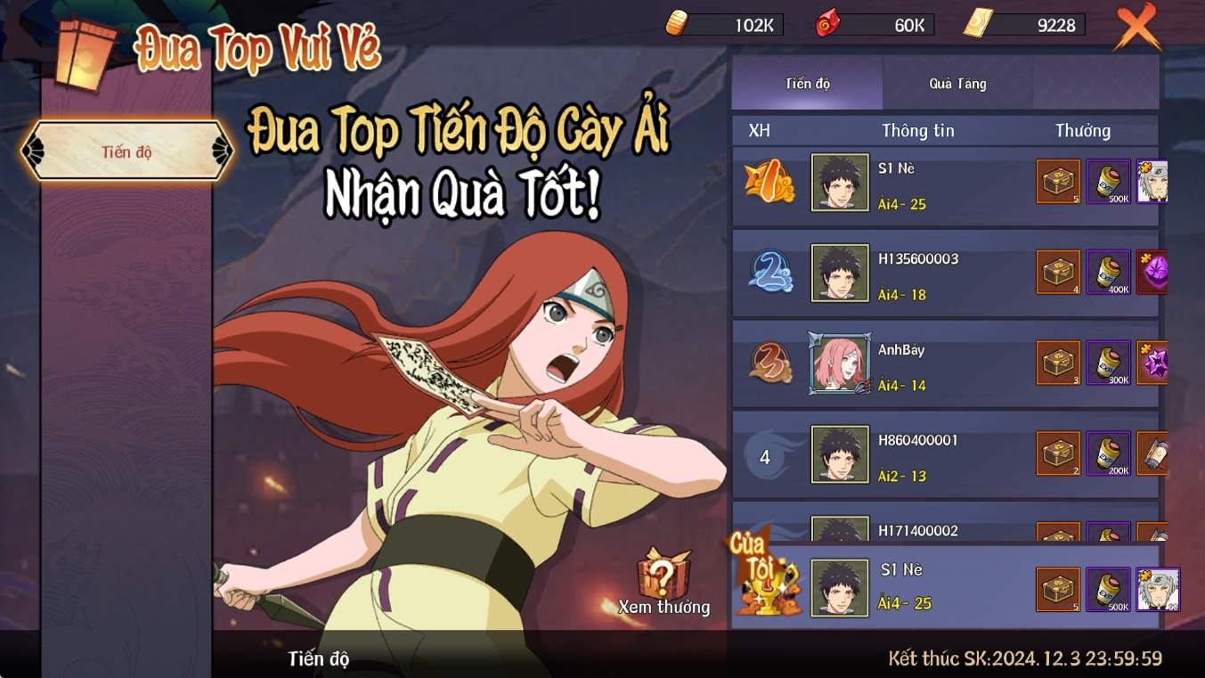 - Phần thưởng lớn: Quà Ngẫu Nhiên Ninja Tr.,Thuyết Hiếm