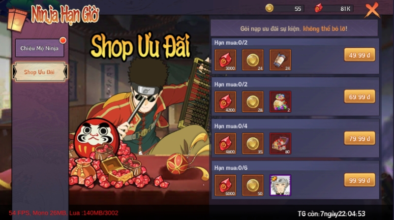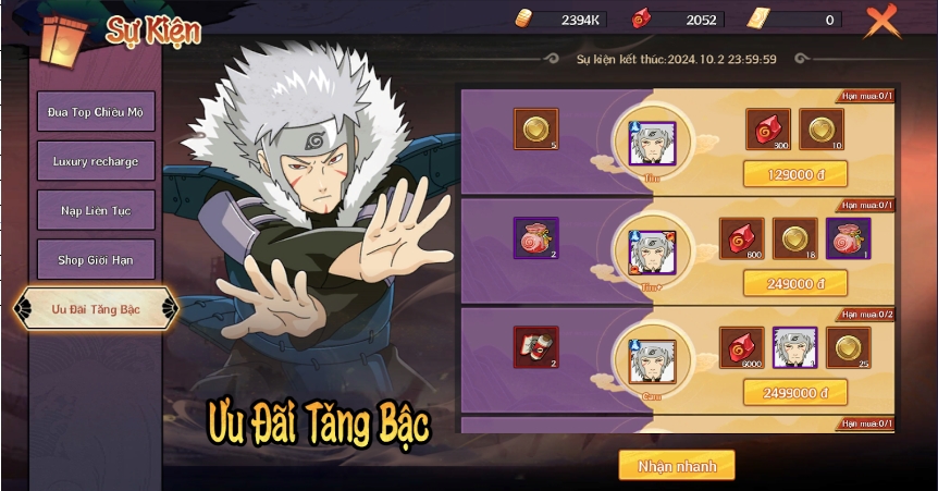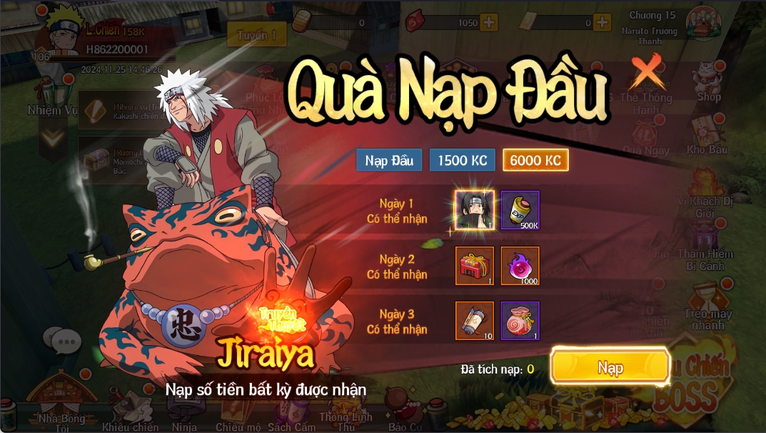 + Nhóm 1: Nạp bất kỳ số tiền sẽ nhận ngay phần thưởng giá trị trong 3 ngày, như: Ninja Jiraiya