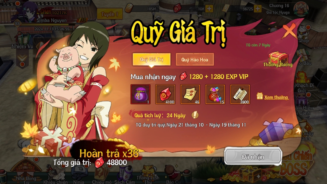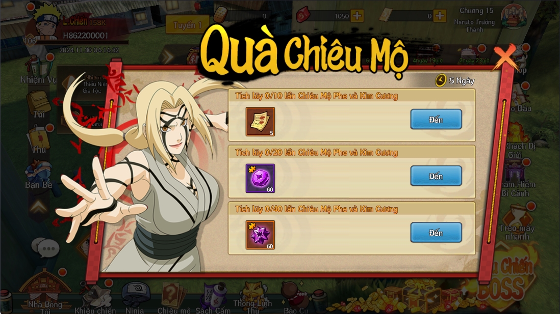 + Nhóm 2: Khi tích luỹ số tiền nạp tối thiểu tương ứng 1500 Kim Cương sẽ nhận thưởng giá trị trong 3 ngày, như: Túi Chọn Ninja Duyên - TB Tím - Lệnh Chiêu Mộ Vàng