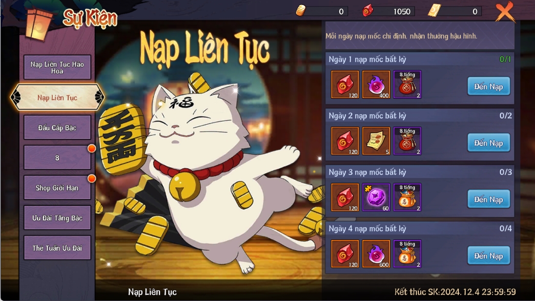 - Trong thời gian diễn ra sự kiện, hằng ngày khi nạp tối thiểu 29K sẽ nhận thêm phần thưởng nạp của ngày đó