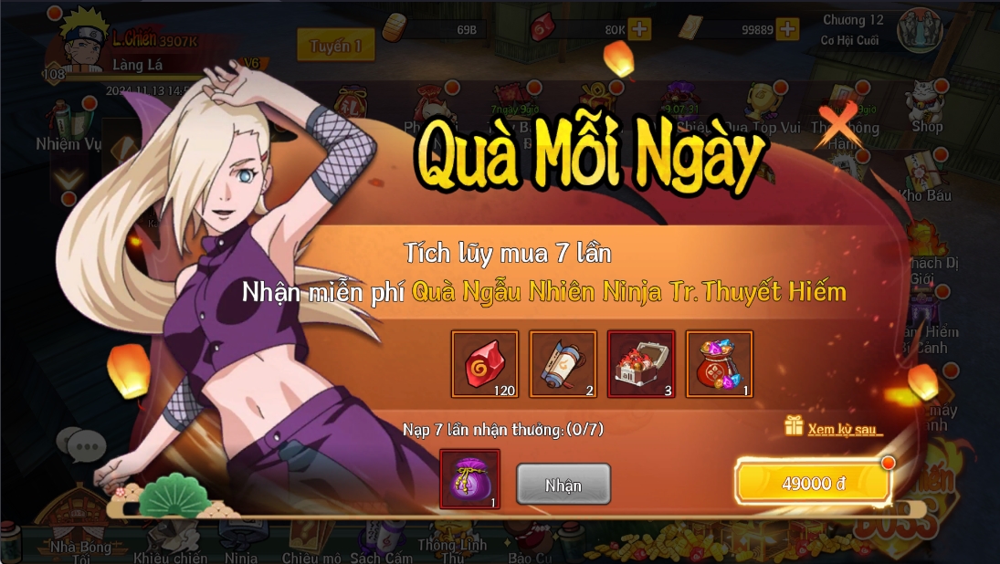 - Mỗi ngày chỉ cần 49K và mua 1 gói quà sẽ nhận ngay gói quà đó, tích luỹ số lần mua đạt 7 ngày sẽ nhận thêm phần thưởng lớn.
