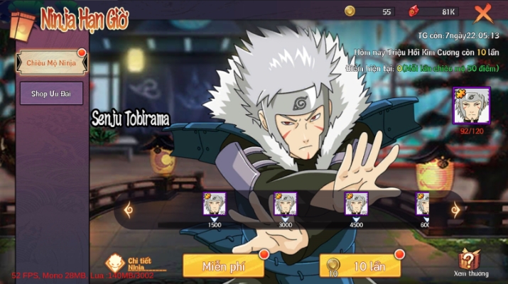 - Trong thời gian sự kiện người chơi có thể kiếm được Mảnh Senju Tobirama thông qua sự kiện chiêu mộ đặc biệt