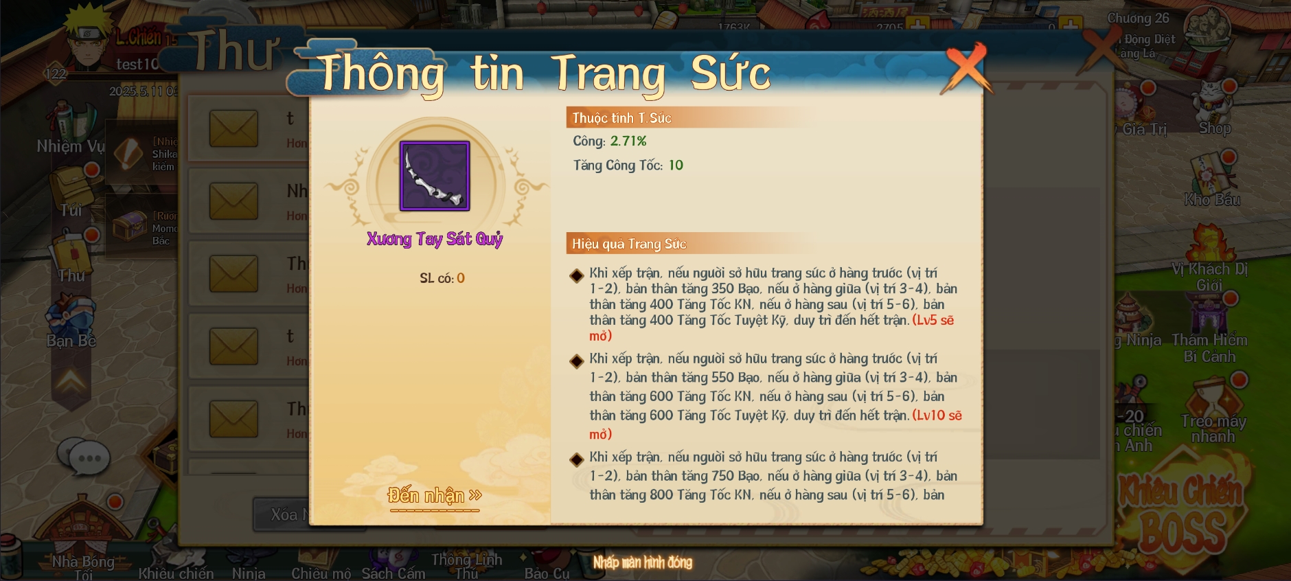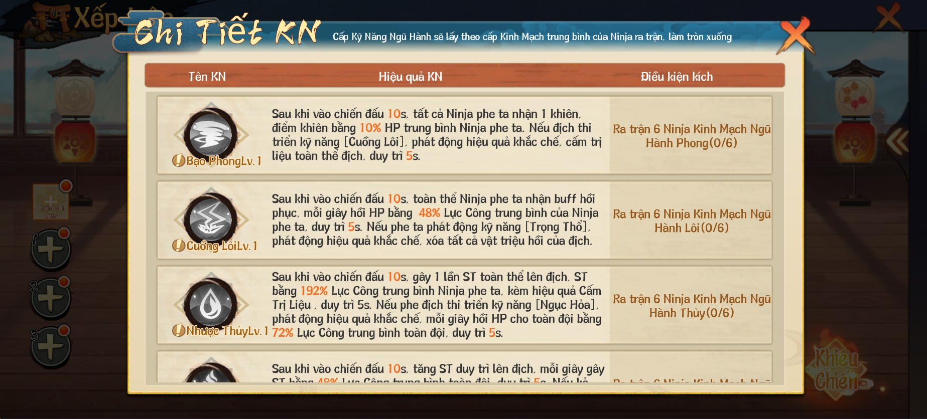 - Hiệu ứng Kỹ Năng Phụ Kinh Mạch có thể phát huy khi 6 Ninja cùng Ngũ Hành ra trận (chi tiết có thể xem tại giao diện trong game)