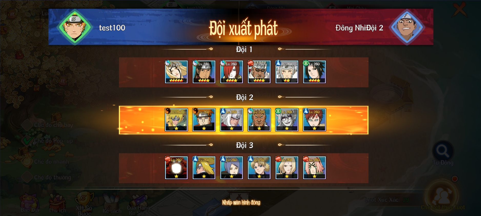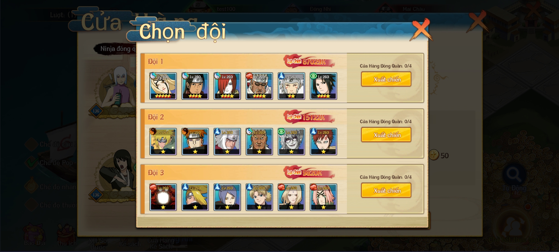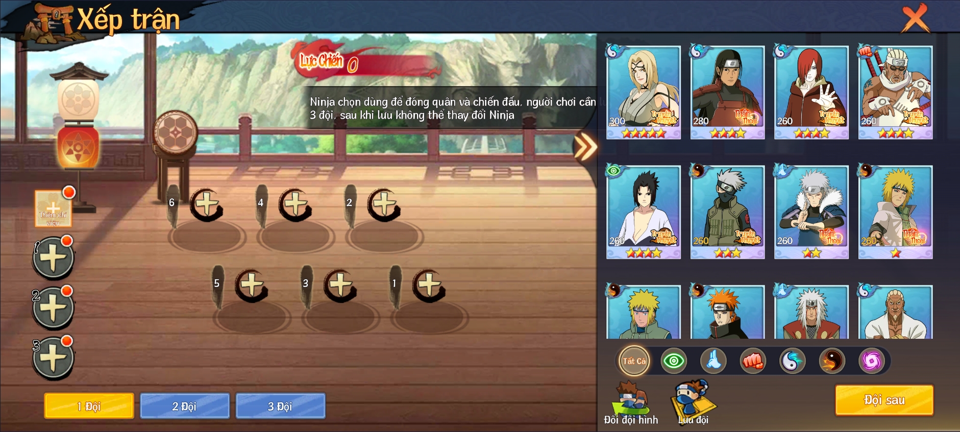 - Sau khi chọn xong sẽ bắt đầu chọn 3 đội hình để tham gia và mỗi đội hình có thể mang theo 6 Ninja - Thông Linh Thú và Chi Viện.