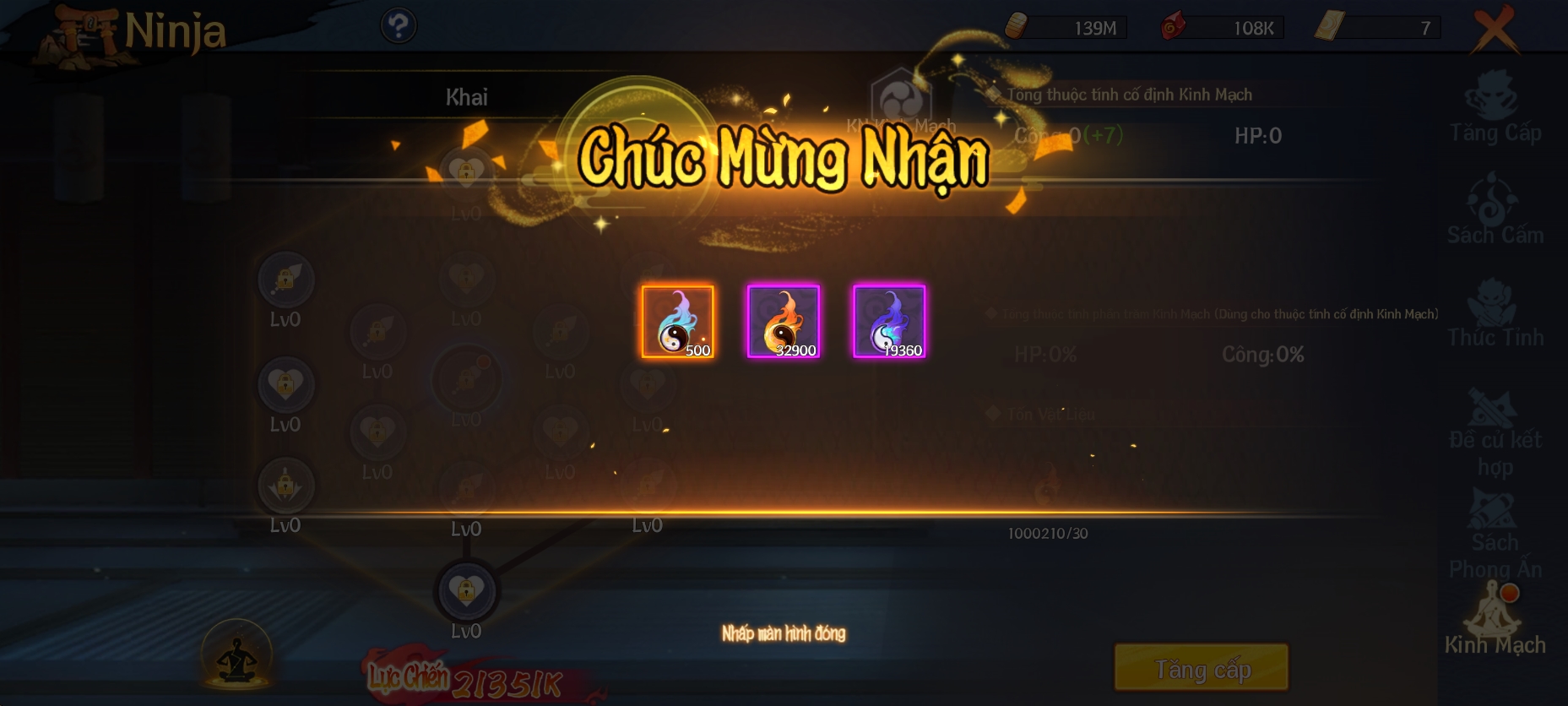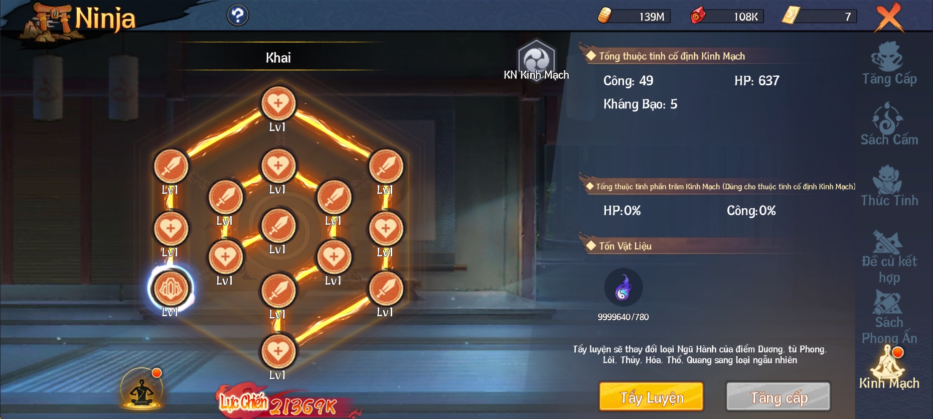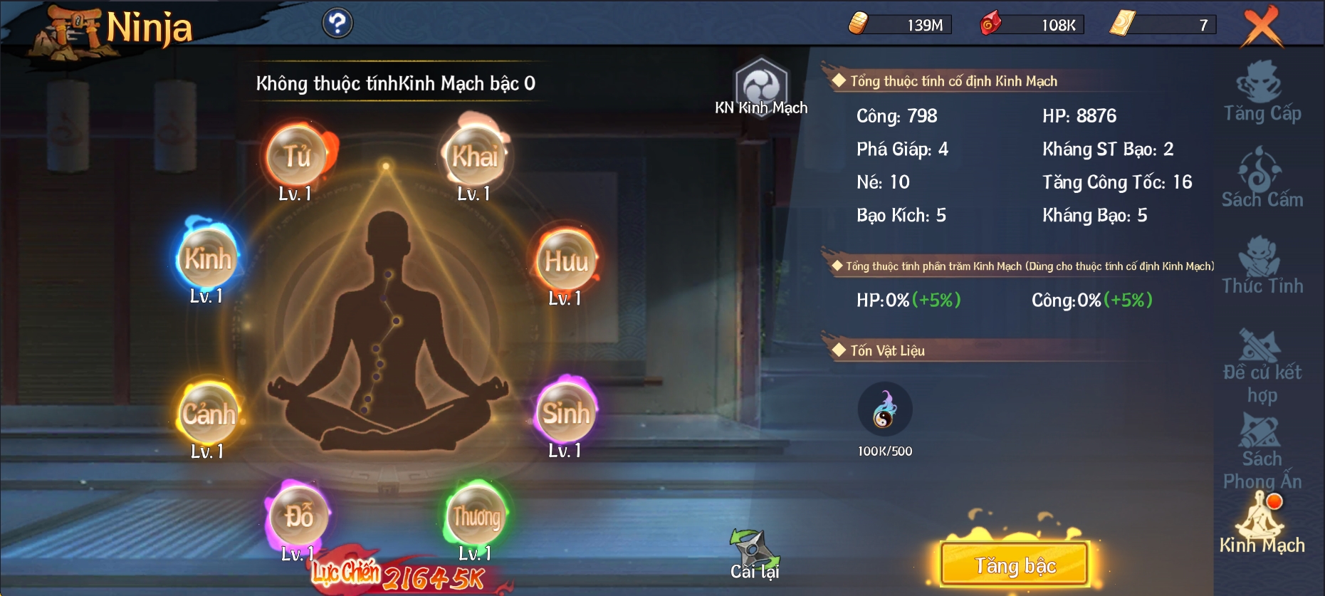 - Tăng bậc cần tất cả 8 điểm mạch còn lại cùng level mới có thể tăng bậc tiếp theo. Lúc tăng bậc sử dụng đạo cụ "Nguyên Khí"