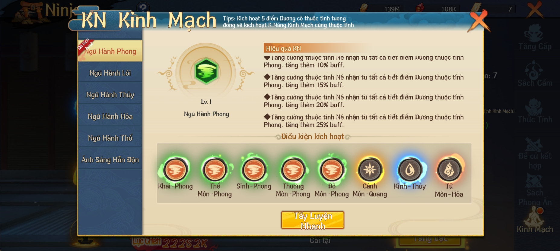 - Tại giao diện KN Kinh Mạch khi chọn 1 trong cách ngũ hành và sau đó tẩy luyện nhanh thì hệ thống sẽ tẩy luyện từng điểm mạch theo đúng ngũ hành đang chọn cho đến khi đủ 5 điểm mạch cùng ngũ hành thì sẽ dừng.