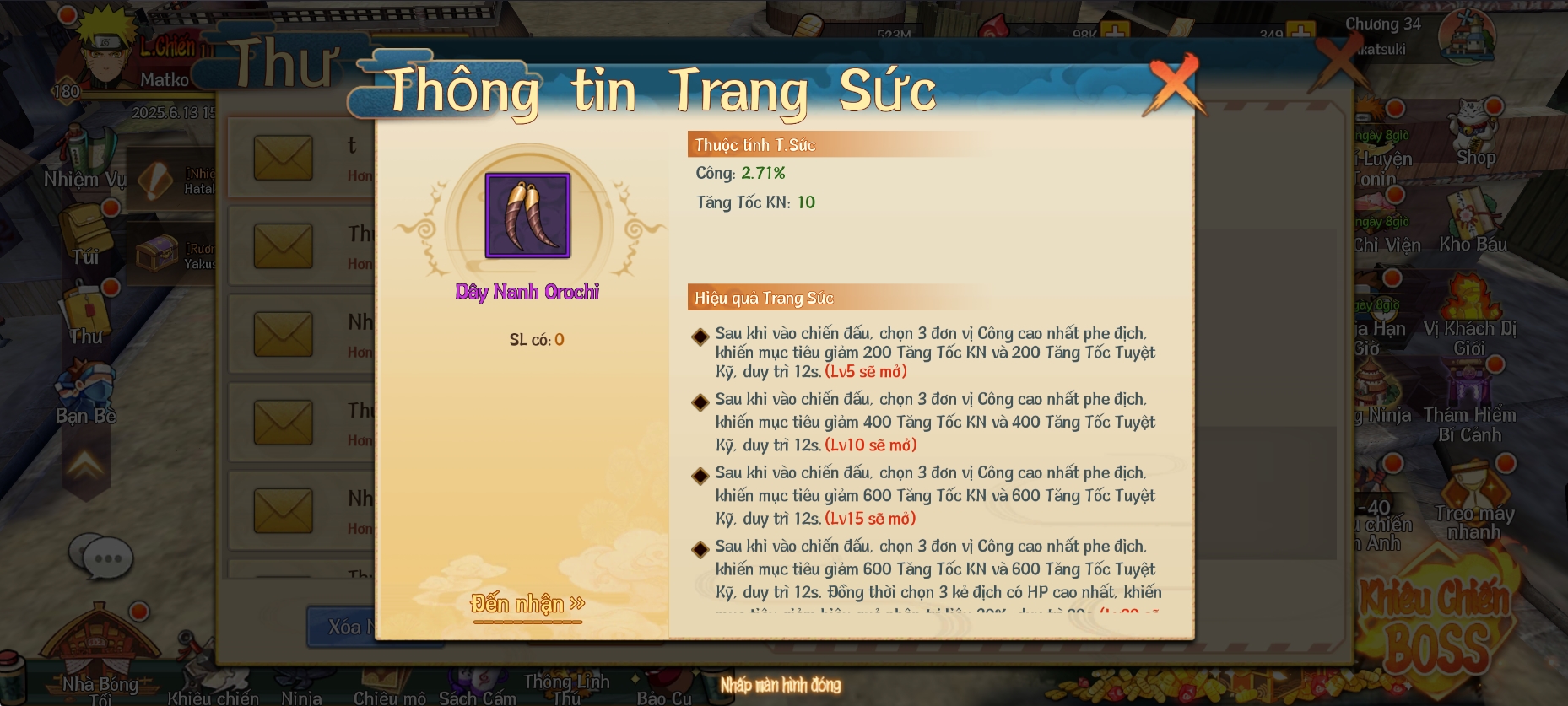Dây Thừng Vàng | Khi HP dưới x% phát động, rút ngẫu nhiên ngôn linh của 1 Ninja địch, khiến mục tiêu mất hiệu lực tất cả kỹ năng, duy trì 10s, mỗi trận phát động 1 lần (level 40 kích hoạt) |