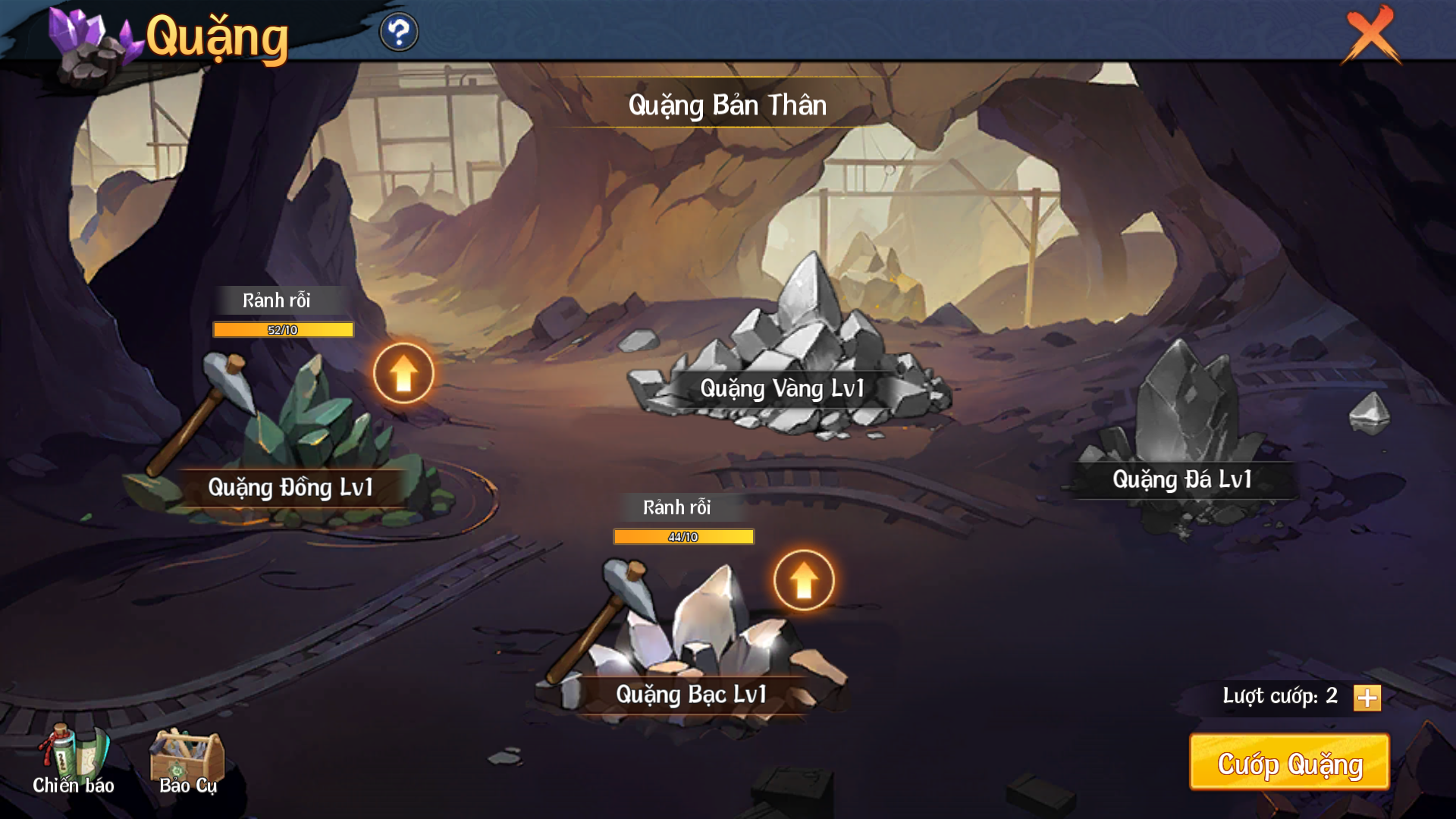 - Mỗi ngày có thể tiến hành đi cướp Mỏ 2 lần và có thể dùng Kim Cương mua thêm 1 lần.