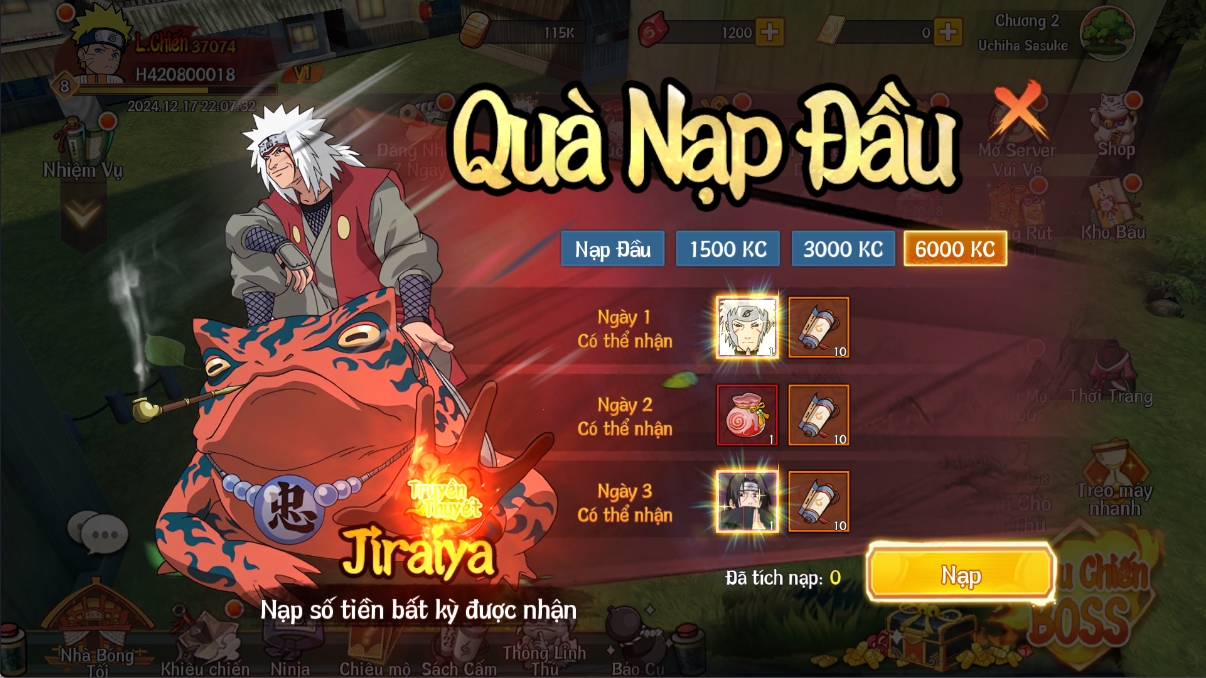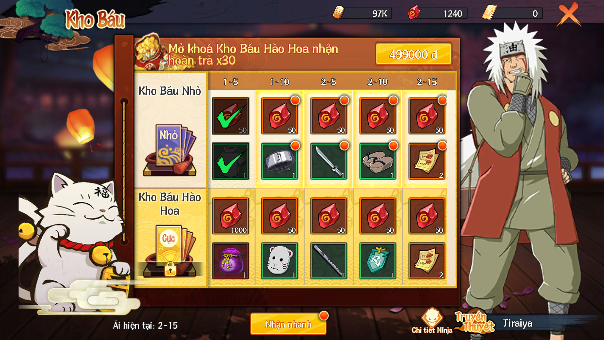 - Chỉ với 499K vnđ thì Nhẫn Giả sẽ nhận thêm nhiều thưởng hấp dẫn như: trang bị, túi Ninja Hiếm, Kim Cương,...