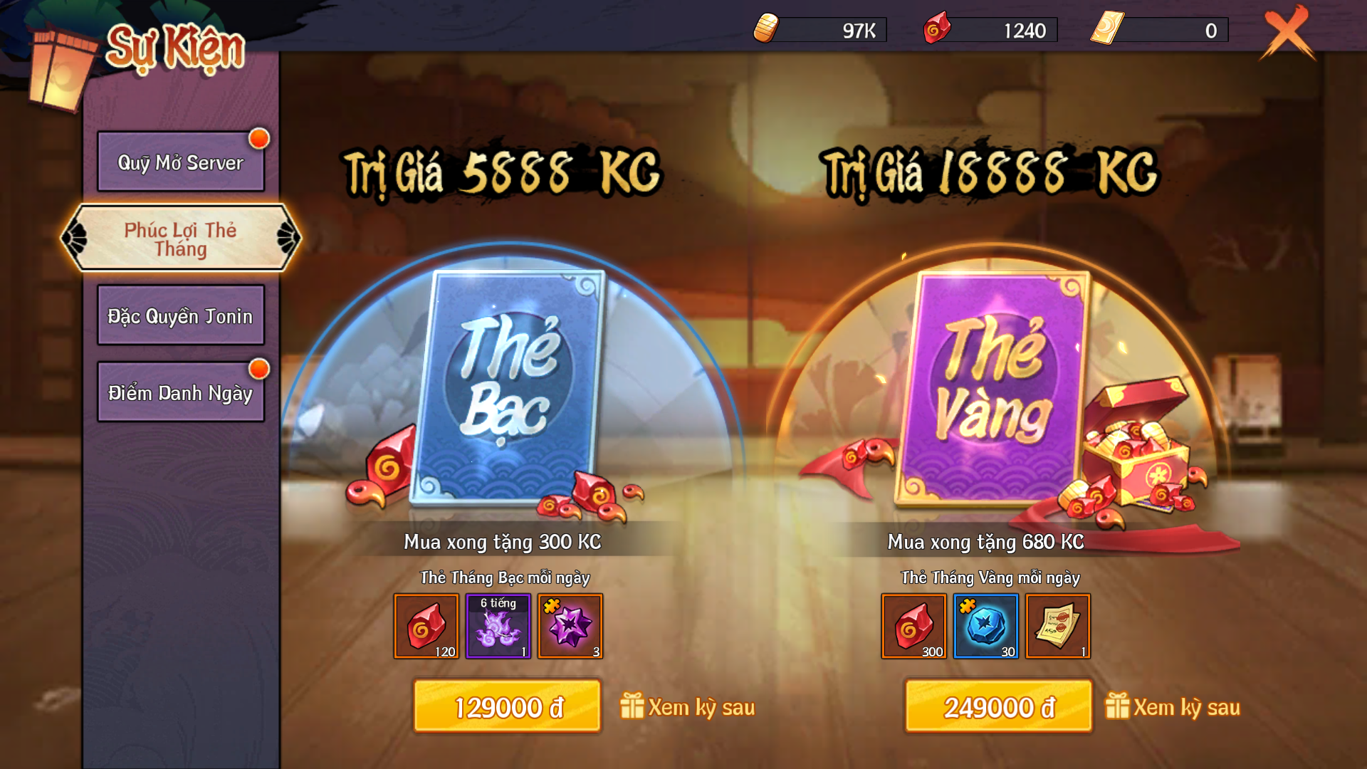 - Thẻ Bạc (chỉ với 129.000vnđ): mỗi ngày nhận thưởng hấp dẫn trong 30 ngày
