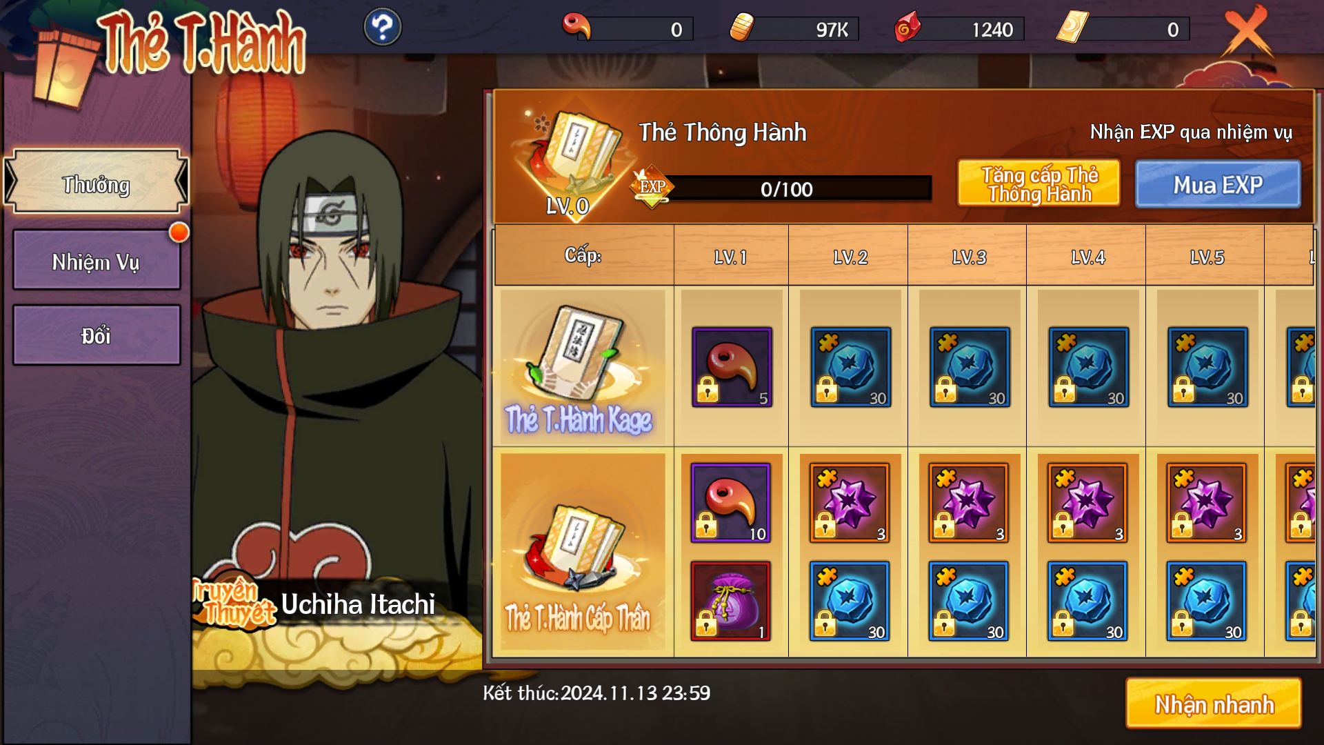 - Bên cạnh đó nếu nhận đầy đủ tất cả phần thưởng từ miễn phí đến phần quà kích hoạt sẽ nhận ngay thêm TB Chuyên Thuộc của Ninja Uchiha Itachi từ sớm nhằm khẳng định sức mạnh