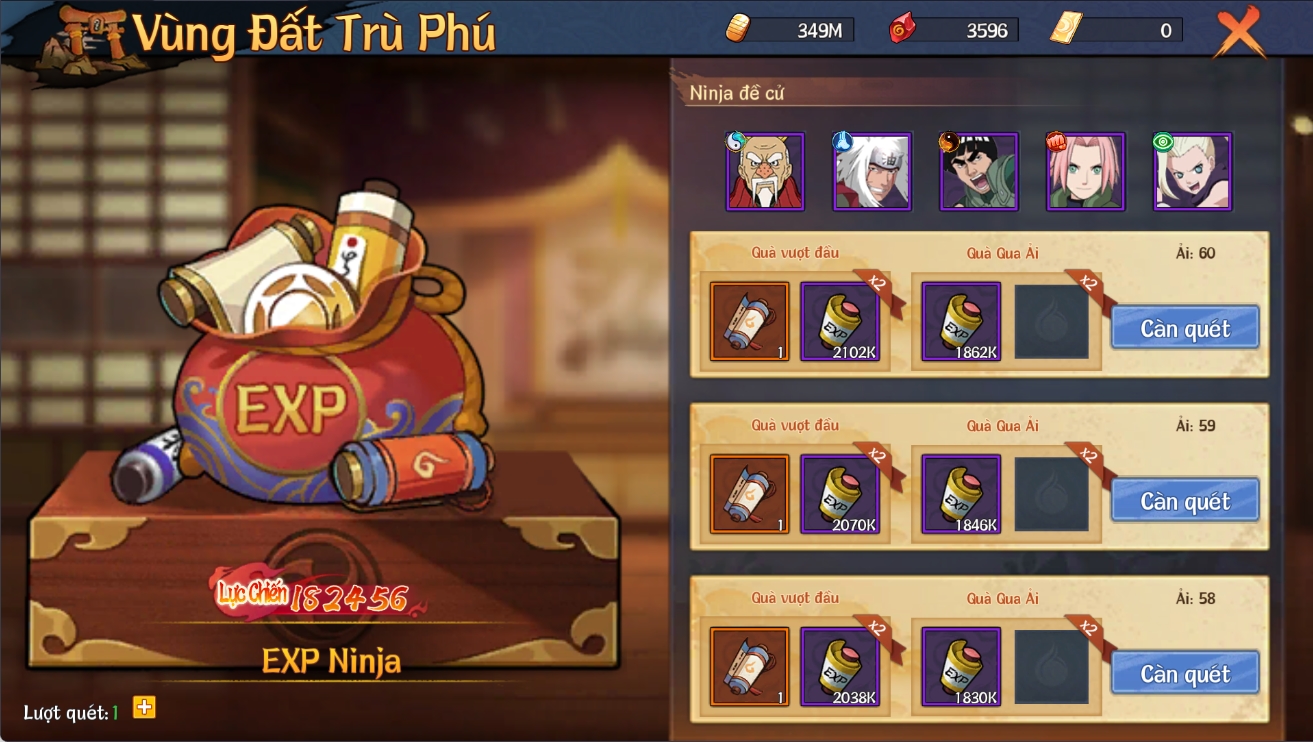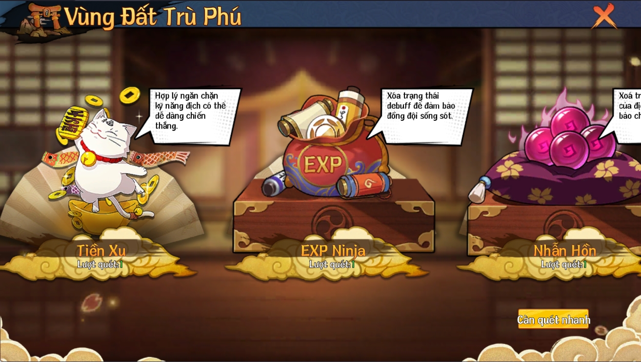 - Vùng Đất Trù Phú là nơi người chơi có thể kiếm các vật liệu bồi dưỡng cơ bản Ninja như: Tiền Xu - Exp Ninja - Nhẫn Hồn - Cấm Thuật